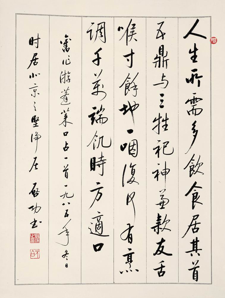 备注:1985年作 。题识:旧作游蓬莱口占一首,一九八五年冬日,时居北京之坚净居,启功书。印文:启功之印、元白、达门。备注:2512bj-bl得自书画机构。