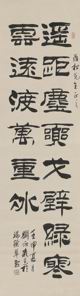备注:创作年代:壬申1992年。录文:遥距尘嚣戈壁绿,寒云远渡万重冰。款识:维松先生正之。壬申夏月,刘炳森书于瑞德草堂。钤印:刘炳森印(白)、海村农(朱)。说明:上款人:(蒋维崧:(1915-2006)中国文字语言学家、书法篆刻家.历任山东大学中文系教授、副主任。备注:2601zj-xlys得自书画机构。备注:2601zj-xlys得自书画机构。