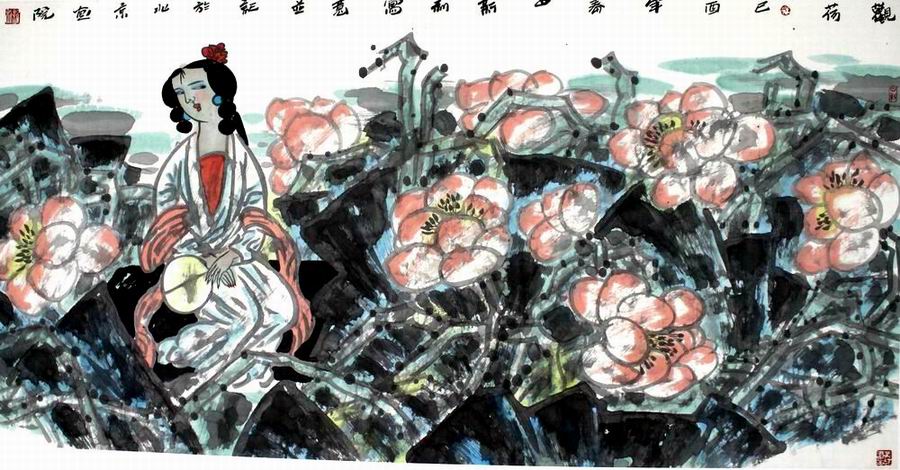 备注:款识:新利。钤印:观荷乙酉年春日新利写意并记于北京画院。备注:(得自画家本人)