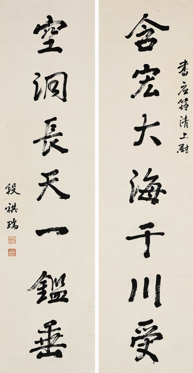 备注:释文:含宏大海千川受,空洞長天一鑑垂。款式:書應筠清上尉。段祺瑞。 鈐印:「段祺瑞印」、「建威將軍」。上款人简介:施筠清(1886~1934),名魁和,民国时曾同时兼任苏州第一区区长、苏州救火会联合会会长、吴县商会主席委员、国货陈列馆馆长等十六职。期间他为苏州人民办了许多好事,因而口碑甚佳。备注:2401rb-jj。2406bj-zhx。