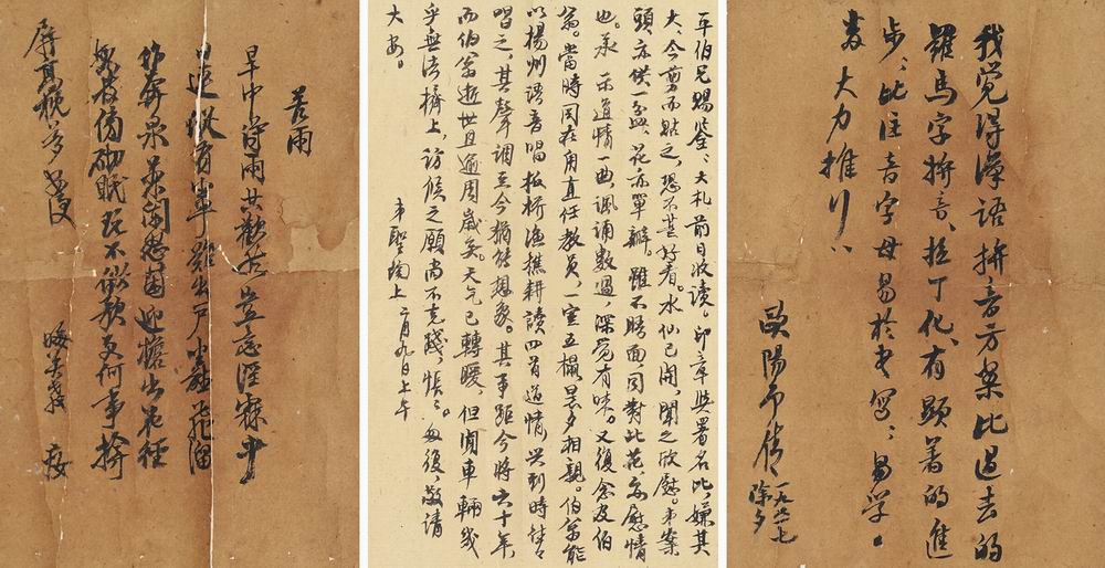 释文:1.我觉得汉语拼音方案比过去的罗马字拼音拉丁化,有显著的进步。比注音字母易于书写,易学,当大力推行。欧阳予倩。一九五七除夕。2.平伯兄赐鉴:大札前日收读,印章奖署名比,嫌其大,今剪而贴之,恐不甚好看。水仙已开,闻之欣慰。弟案头亦供一盆,花亦单瓣。虽不晤面,同对此花,亦慰情也。承示道情一曲,讽诵数过,深觉有味。又复念及伯翁。当时同在甪直任教员,一室五榻,曩夕相亲。伯翁能以扬州语音唱板桥《渔樵耕读》四首道情,兴到时往往唱之,其声调至今犹能想象。其事距今将去十年,而伯翁逝世且逾周岁矣。天气已转暖,但闻车辆几乎无法挤上,访候之愿尚不克践,怅怅。匆复,敬请大安。弟圣陶上。二月九日上午。3.苦雨。旱中得雨共欢然,岂忘湿霖中日连。纵有坐车难出户,坐听飞溜作奔泉。菜栏怒菌迎檐出,花径繁枝傍砌眠。玩不莺歌更何事,掩屏高枕梦安便。晦教。瘿。