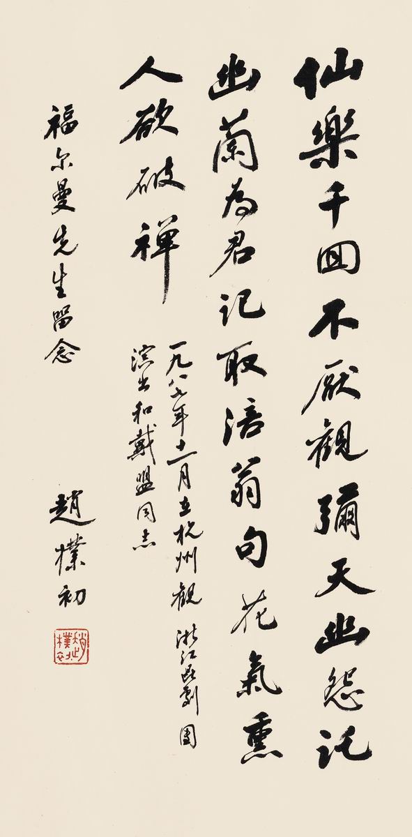 备注:【款识】一九八七年十一月在杭州观浙江昆剧团演出,和戴盟同志。福尔曼先生留念,赵朴初。【钤印】赵朴初(朱文)。【释文】仙乐千回不厌观,弥天幽怨托幽兰,为君记起涪翁句,花气熏人欲破禅。备注:1504bj-bl得自书画机构。2401bj-zhx。2512bj-bhx。【说明】2025年10月23日孔子第七十一代孙、文化禅僧清无法师鉴定为真迹并附鉴定证书。