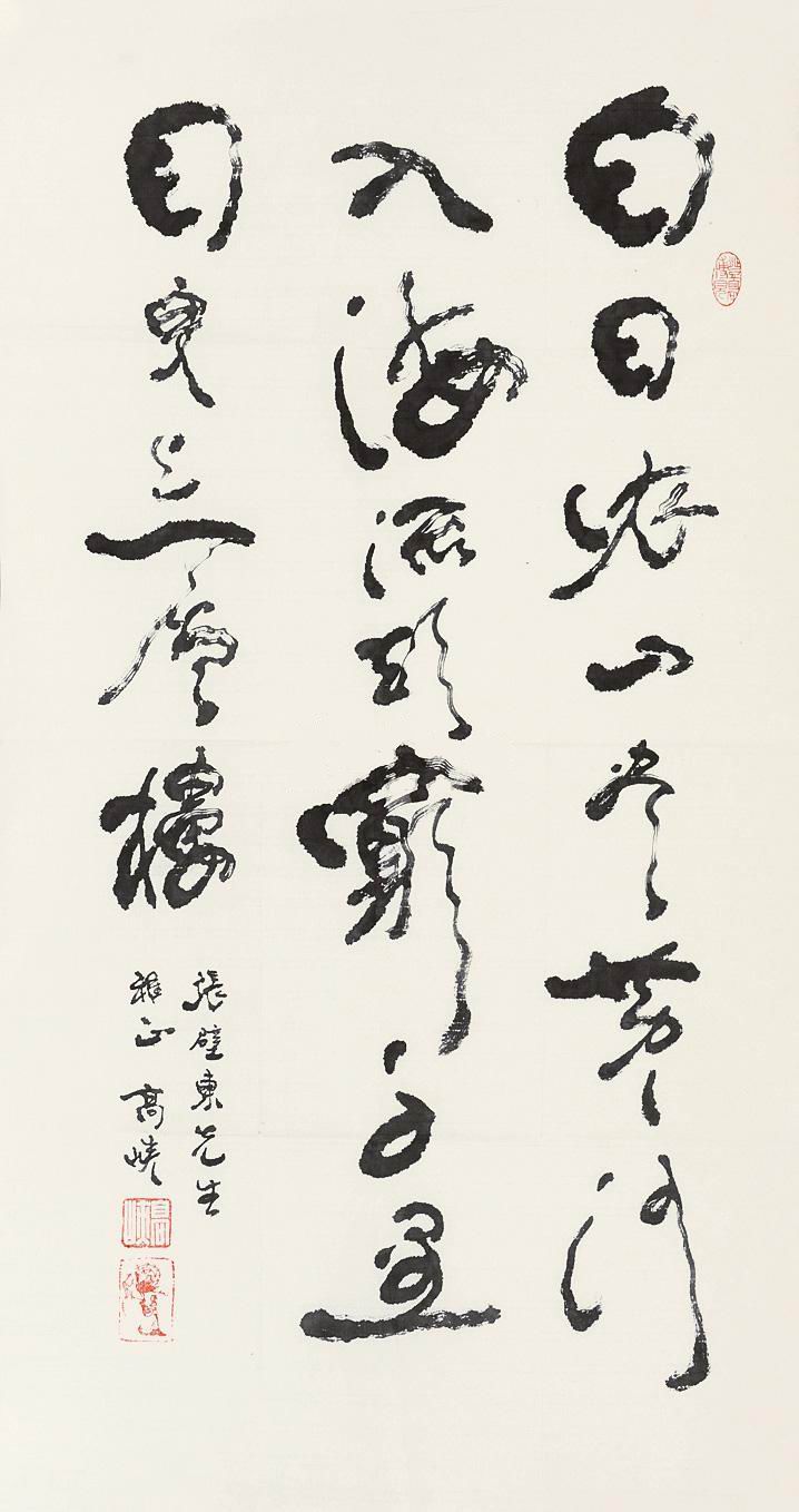 备注:款识:张璧东先生雅正,高峡。 印鉴:高峡(白)、丰高传见(朱) 释文:白日依山尽,黄河入海流。欲穷千里目,更上一层楼。 备注:得自海外并附文物出入境单。 高峡,著名书画家、碑石专家,陕西书画艺术研究院名誉院长(120812ch